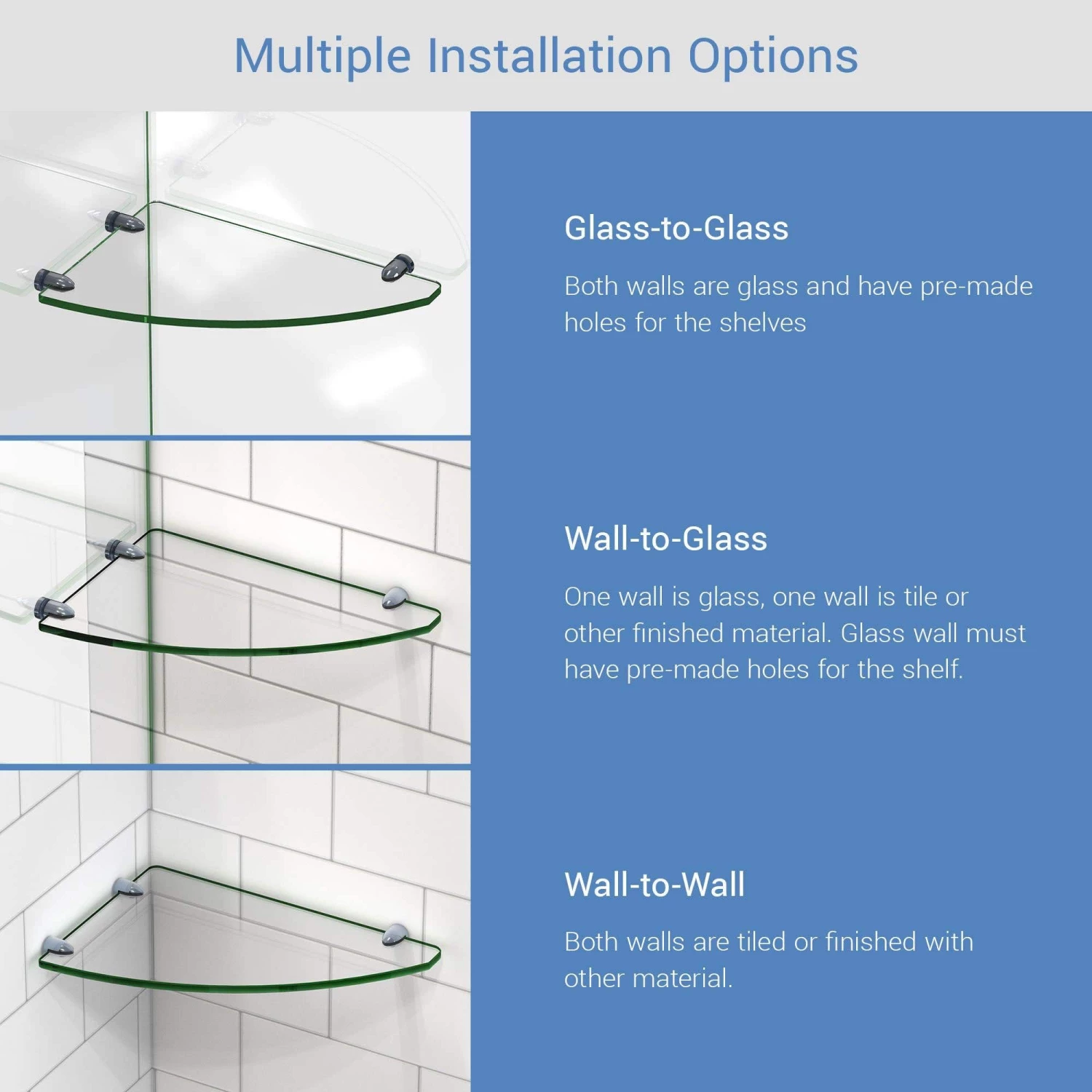 Brighten up your shower space with elegant glass shelves from DreamLine. Glass corner shower shelves are an ideal way to add inconspicuous utility to your shower stall. This 12-inch glass shelf offers increased function with a safe, smooth edge and space for your shower necessities. The floating shower shelf design is strong and perfect for both traditional and contemporary styles. The discreet mounting hardware allows for quick installation to glass, tile, or drywall. Durable 5/16-inch thick glass shelf is supported by stainless steel brackets available in 4 finishes to coordinate with any bathroom décor.Choose DreamLine for the ultimate solution for your shower project.