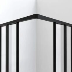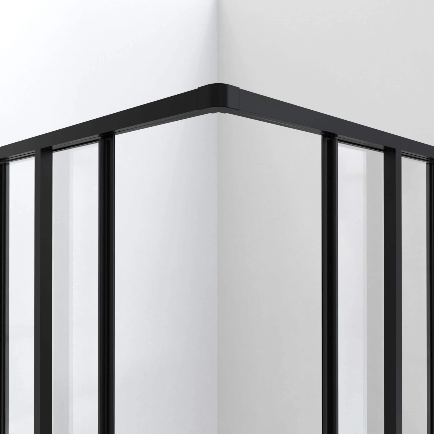 - Two sliding panels, with two stationary panels on sides meet to create corner walk through