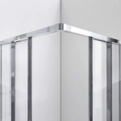 - Two sliding panels, with two stationary panels on sides meet to create corner walk through