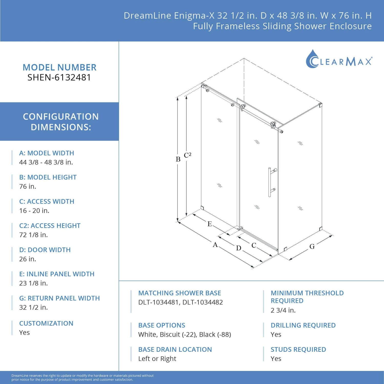 - DreamLine exclusive ClearMax water and stain resistant glass coating