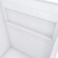 Walk-in and roll-in functions characterize this spacious, accessible shower from Renovate Bath, featuring a beveled entry and an expansive and easy-to-reach shelving niche. Textured, slip-resistant flooring adds safety to the right drain shower pan, while adaptive design supports accessory installation. The timeless subway tile backsplash pattern in Premium AcrylX is attractive and resilient.